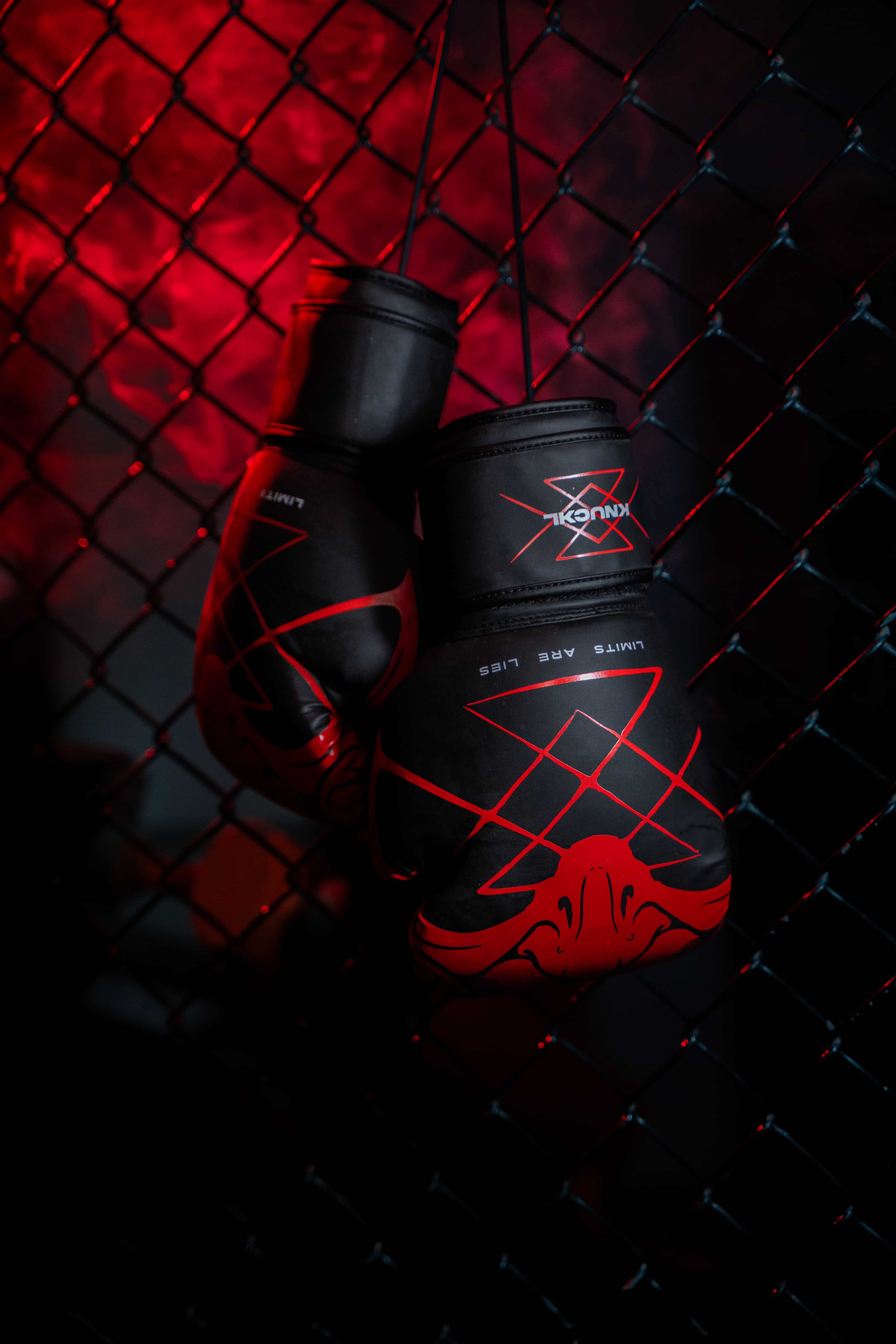 • Black leather boxing gloves with embossed Knuckl symbol hanging on chain-link fence under red light
