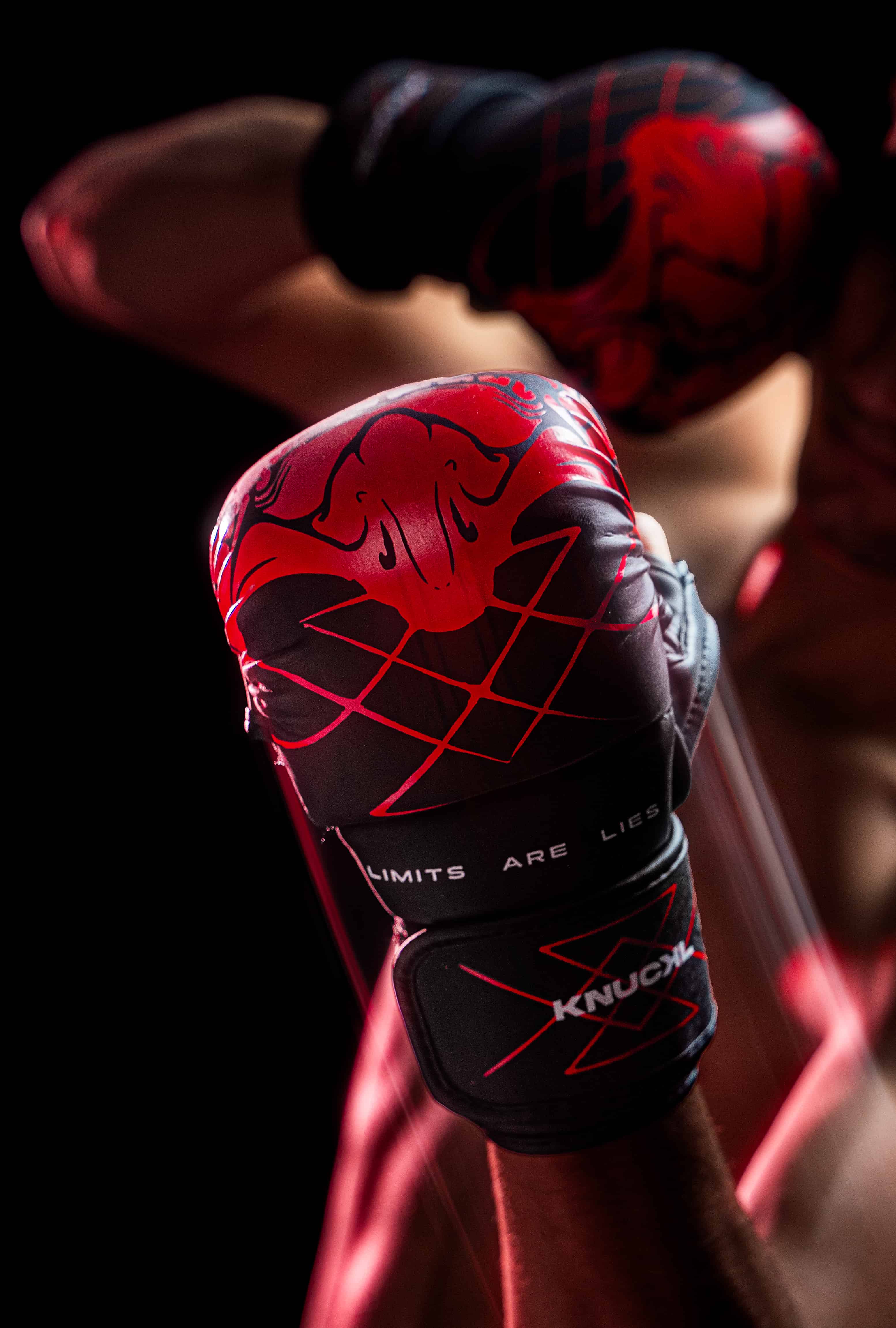 Boxer wearing Knuckl Oni boxing gloves in a dramatic dark-themed pose with red and black gear